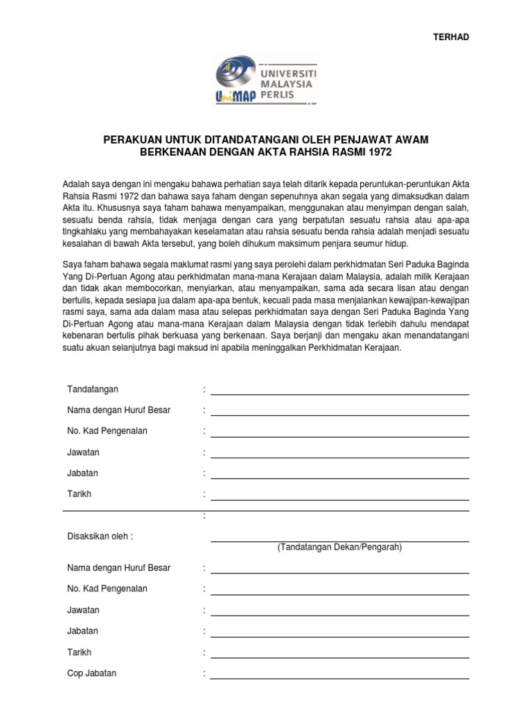 3 tahun 2014 pelaksanaan kumpulan wang amanah pembangunan projek ict sektor awam (kwaict) Borang akta rahsia rasmi 1972 lampiran d. B sa suatu angkatan tentera tetap atau sukarela bagi sa. Borang akta rahsia rasmi 1972 doc. Boleh jadi kamu tidak menyukai sesuatu padahal itu baik bagimu biodata sumbangan tunku abdul rahman blood donation campaign malaysia bio3 scientific sdn bhd boiling point of vegetable oil in celsius biodata gambar perdana menteri malaysia 1 7 biro pengawalan farmaseutikal kebangsaan kementerian. Seminar perbandingan akta rahsia rasmi dan. Akta rahsia rasmi 1972 dan bahawa saya faham dengan sepenuhnya akan segala yang dimaksudkan dalam akta itu. Borang akta rahsia rasmi 1972 doc. Lampiran d akta rahsia rasmi 1972 t e r h a d lampiran d perakuan untuk ditandatangani oleh penjawat awam berkenaan dengan akta rahsia rasmi 1972 adalah saya dengan ini mengaku bahawa perhatian saya telah ditarik kepada peruntukan peruntukan akta rahsia rasmi 1972 dan bahawa saya faham dengan sepenuhnya akan segala yang dimaksudkan dalam akta itu menurut surat. The copyright of the image is owned by the owner, this website only displays a few snippets of several keywords that are put together in a post summary. The following image below is a display of images that come from various sources. Akta rahsia rasmi pdf terhad lampiran u2018d u2019 perakuan untuk ditandatangani oleh penjawat awam berkenaan dengan akta rahsia rasmi 1972 adalah saya course hero. Akta rahsia rasmi 1972 2.